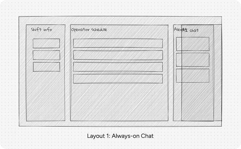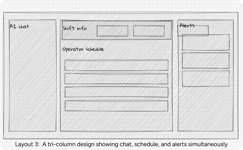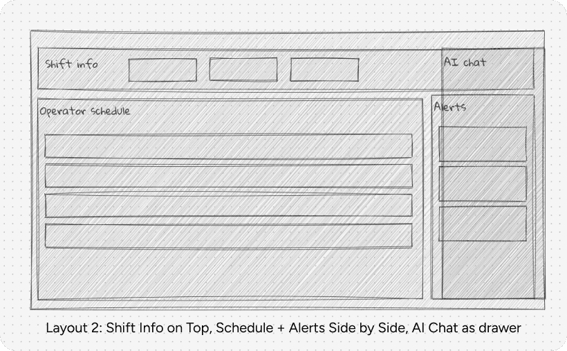 I sketched multiple layout directions for the Operator Hub. The goal was to find a structure that put critical operator tasks at the center, while also making AI support accessible without overwhelming the experience.